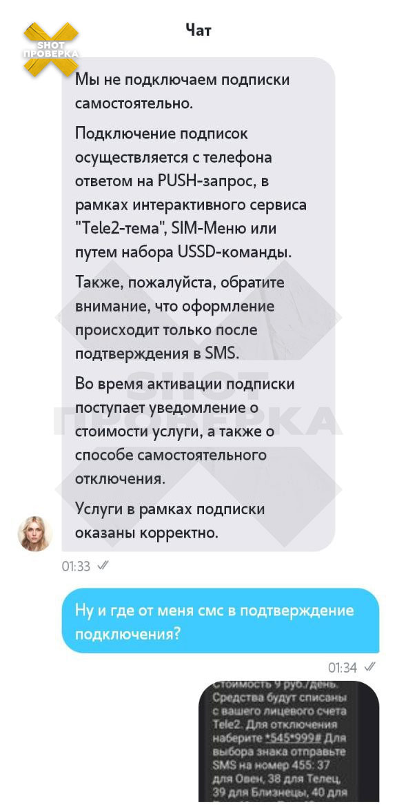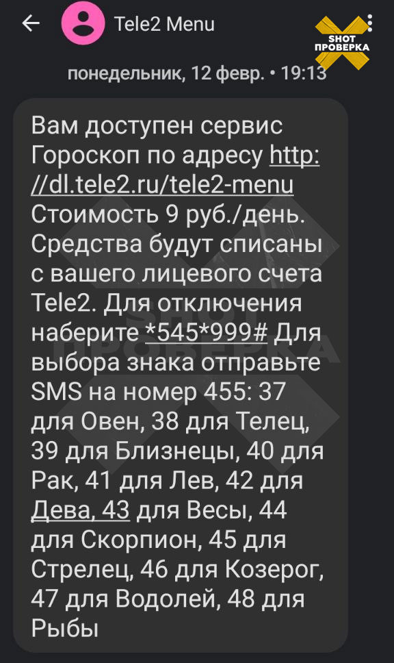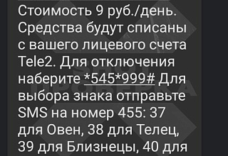 Подключение к рассылке гороскопов произошло без ведома и согласия абонента, что вызвало негодование у потерпевшего. Для отключения услуги требовалось отправить специальный запрос, об этом Олег узнал лишь после обращения в службу поддержки Tele2.