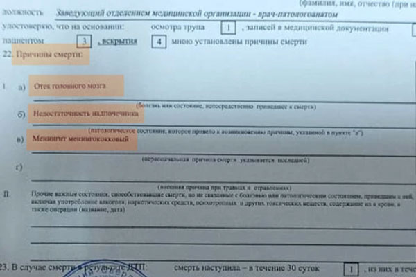 Отец умершего молодого человека утверждает, что его сын не страдал от рака крови, как было распространено менеджером Ozon в рабочем чате. Рамиль предоставил справку о смерти, где указана причина - менингококковый менингит.